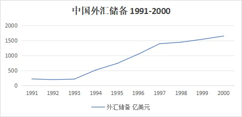 1991年到1993年,我们的外汇储备始终在200亿美元左右徘徊,上不去,1993年还出现了119亿美元逆差。
