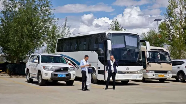 我们俩正说着话,旁边一辆大巴前方突然热闹起来,二三十人在那说说笑笑,接机的人将哈达一条一条,戴到刚下飞机的旅客的脖子上,旅客们双手合什感谢,客气几句,陆续上了大巴。