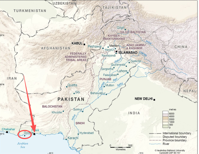 (红色箭头所指,为帕斯尼港,左边红圈处为瓜达尔港)