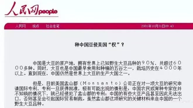 早在2000年4月,孟山都公司向中国申请了一项有关高产大豆检测的专利权,这种大豆其实就是上海郊区的那一株野生大豆的亲本后代,现在却被孟山都申请了专利。