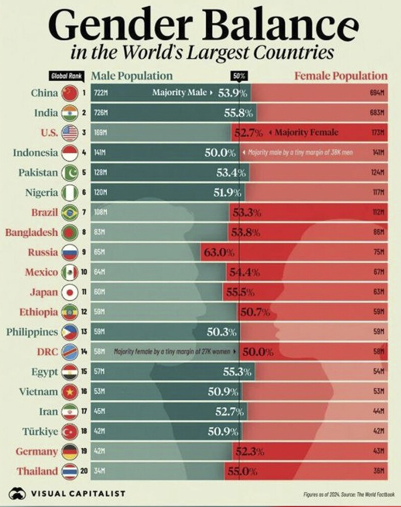 中国互联网上常有段子,劝告大家去俄罗斯找媳妇。玩笑归玩笑,人口性别比例的严重失衡仍是俄罗斯的现实,数据显示,当前俄罗斯女性占比63%,而男性仅占比37%。