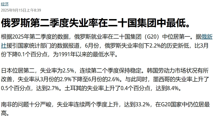 最新数据也并没有让普京失望。2025年第二季度,俄罗斯失业率在二十国集团中处于最低水平,6月份失业率更是达到2.2%的历史新低。