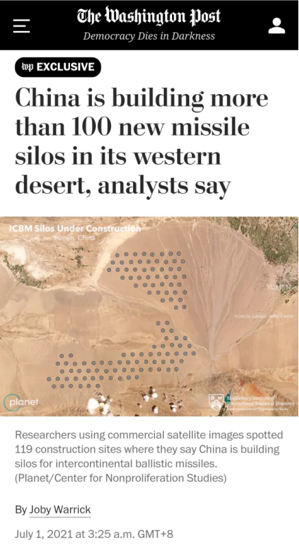 第一,2021年,《华盛顿邮报》报道,中国正在西北沙漠地带建设超过100个导弹“发射井”。