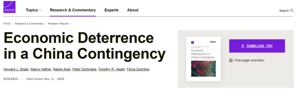 2025年11月6日,美国兰德智库发表了一份研究报告《以经济威慑应对一个中国的突发事件》(Economic Deterrence in a China Contingency),这份报告由施瓦布慈善基金会资助,在兰德智库国家安全研究部(NSRD)的国际安全与防务政策项目框架下开展,报告提供对象是美国国防部长办公室、美国情报界及美国白宫,作为决策的参考依据。