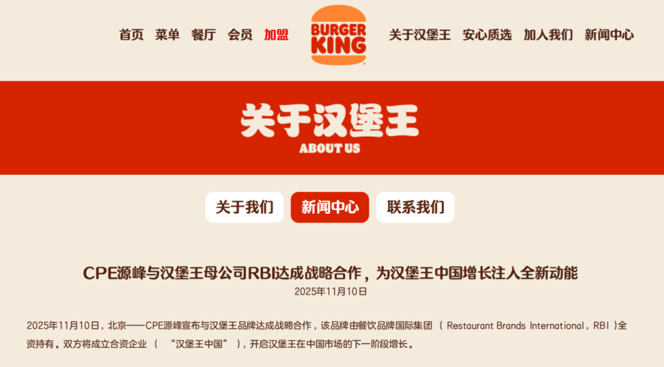 就在11月12日,中国知名投资机构CPE源峰宣布与汉堡王母公司RBI集团达成战略合作,以24.8亿人民币的价格,收购了汉堡王中国业务83%的股权。
