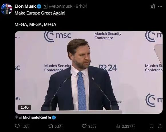 大家还记得万斯今年在慕尼黑安全会议上的演讲么,万斯说,欧洲最危险的不是外部势力,而是内部威胁,公开支持德国、英国、荷兰的极右翼政党,甚至故意不见德国总理朔尔茨,高调会见德国“另类选择党”领导人魏德尔。