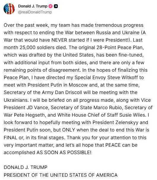 根据金融时报披露,威特科夫和库什纳向乌梅罗夫转交了28点和平计划,乌梅罗夫则当场致电泽连斯基,按着免提,一字一句读给泽连斯基。据说泽连斯基惊掉了下巴,随后提议在日内瓦面谈。