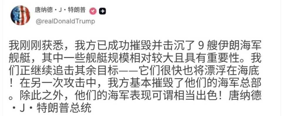 伊朗海军的覆灭是特朗普认证过的,他说已经击沉了伊朗海军9艘舰艇,包括“比较大且重要的目标”。