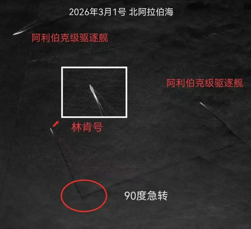 饶是如此,还是有卫星照片发现林肯号航母在海上转了一个90度的弯,这显然是一种规避动作,说明虽然导弹没有命中,但已经对航母造成威胁了。