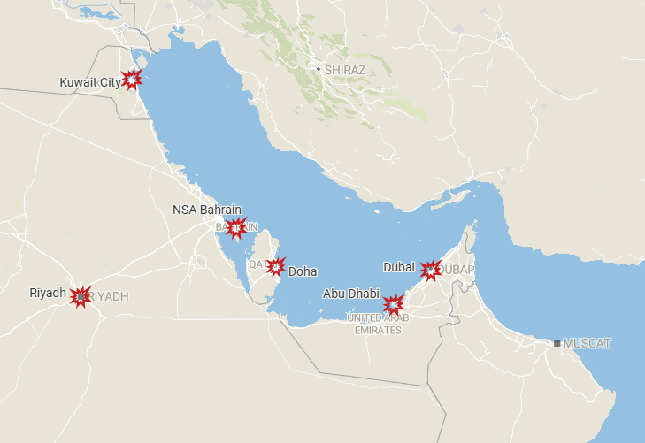 驻扎在巴林的美海军中央司令部第五舰队总部也遭遇了袭击,多个舰用燃油库被命中引爆,一辆爱国者预警雷达车被摧毁。