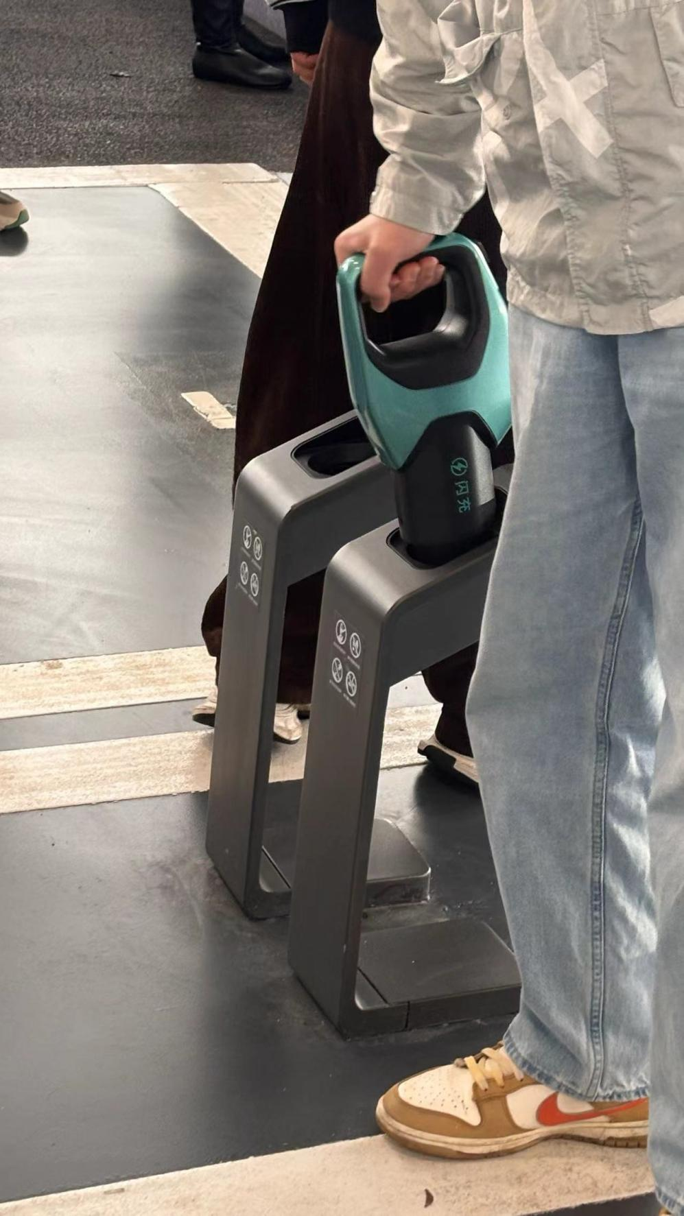 发布会第二天,我就跑到位于比亚迪深圳总部附近的测试场地,一进门就看到三套绿色T字型的充电桩,充电桩的上部用的是滑轮设计,可以左右滑动阻力很小,我提了一下充电枪的份量,差不多两公斤重,单手提起来很轻松。