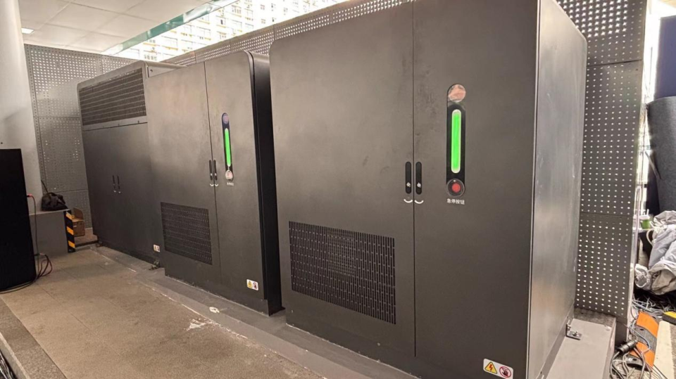 比亚迪的解法是,储充一体系统。在充电站里加一个储能模块,先充电,充完电再集中释放。就是下图这个大家伙。