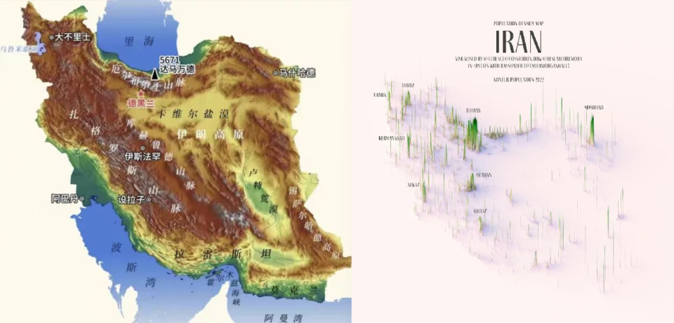 伊朗两大山脉分布图(左),跟伊朗人口分布图(右)是一致的