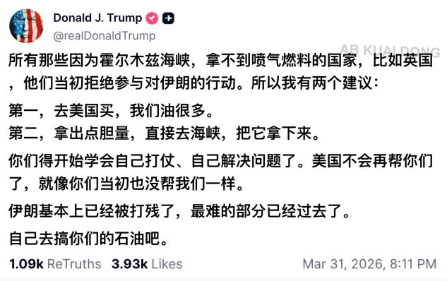 特朗普多次强调,美国不需要霍尔木兹海峡,这不关美国的事。北约国家这些纸老虎如果要油要气,可以找美国买或者自己去护航。