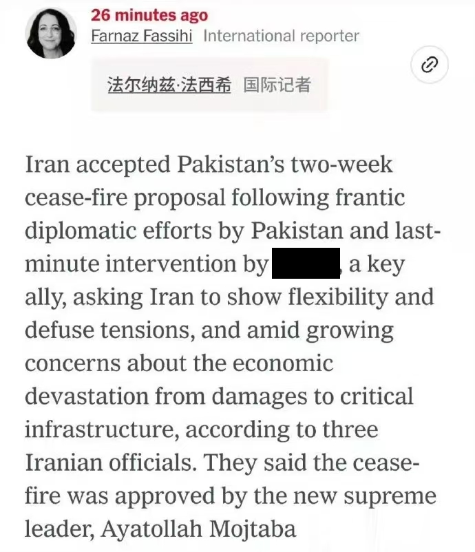 伊朗官员提到,一个“神秘国家”在最后一刻介入,帮巴基斯坦说服了伊朗,最终停火协议得到了伊朗最高领袖的批准。