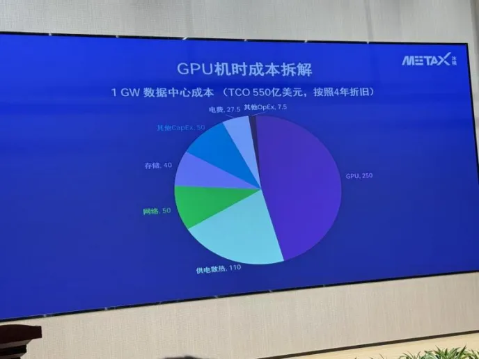 最近,沐曦股份在行业交流会上的一份数据疑似流出,该数据显示,一个1GW的数据中心的成本,GPU成本占了45%,接近一半。