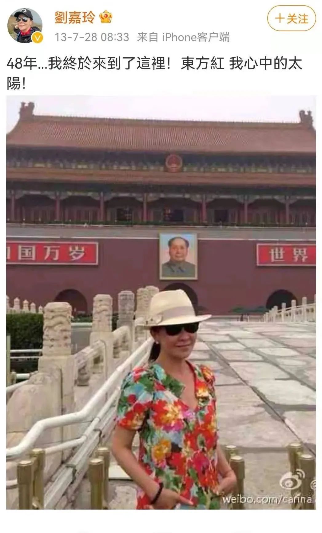 在这之前一年,2013年7月28日,刘嘉玲在微博发了一张和毛泽东画像的合影,配文“48年,我终于来到了这里!东方红,我心中的太阳”,同样遭到了上万名网友的攻击,有媒体写文章嘲讽她,标题是《48岁的县长夫人梦》。